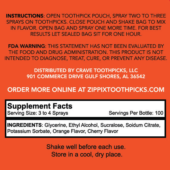 Instructions: Shake well before each use. Spray 2 to 3 times into toothpick pouch, shake pouch to coat toothpicks evenly. Add 1 additional spray then seal pouch. For best results, let sealed pouch sit for 1 hour.
